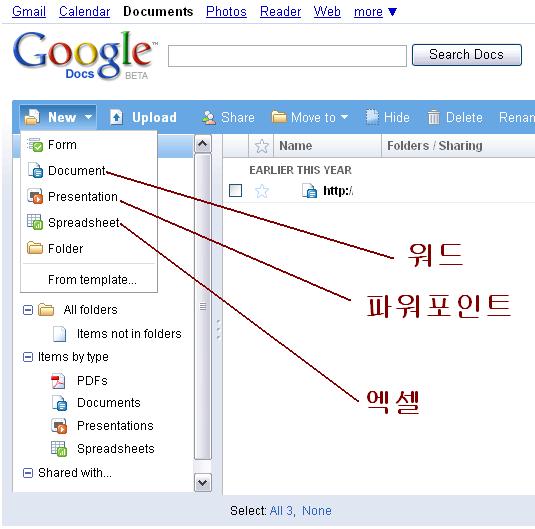 Gmail, Calender, Documents, Photos, Reader, Web, more가 보일것입니다. 거기서 Documents를 클릭하시고 New를 클릭하시면 워드나 파워포인트 그리고 엑셀을 사용하실수 있는 창이 뜹니다.